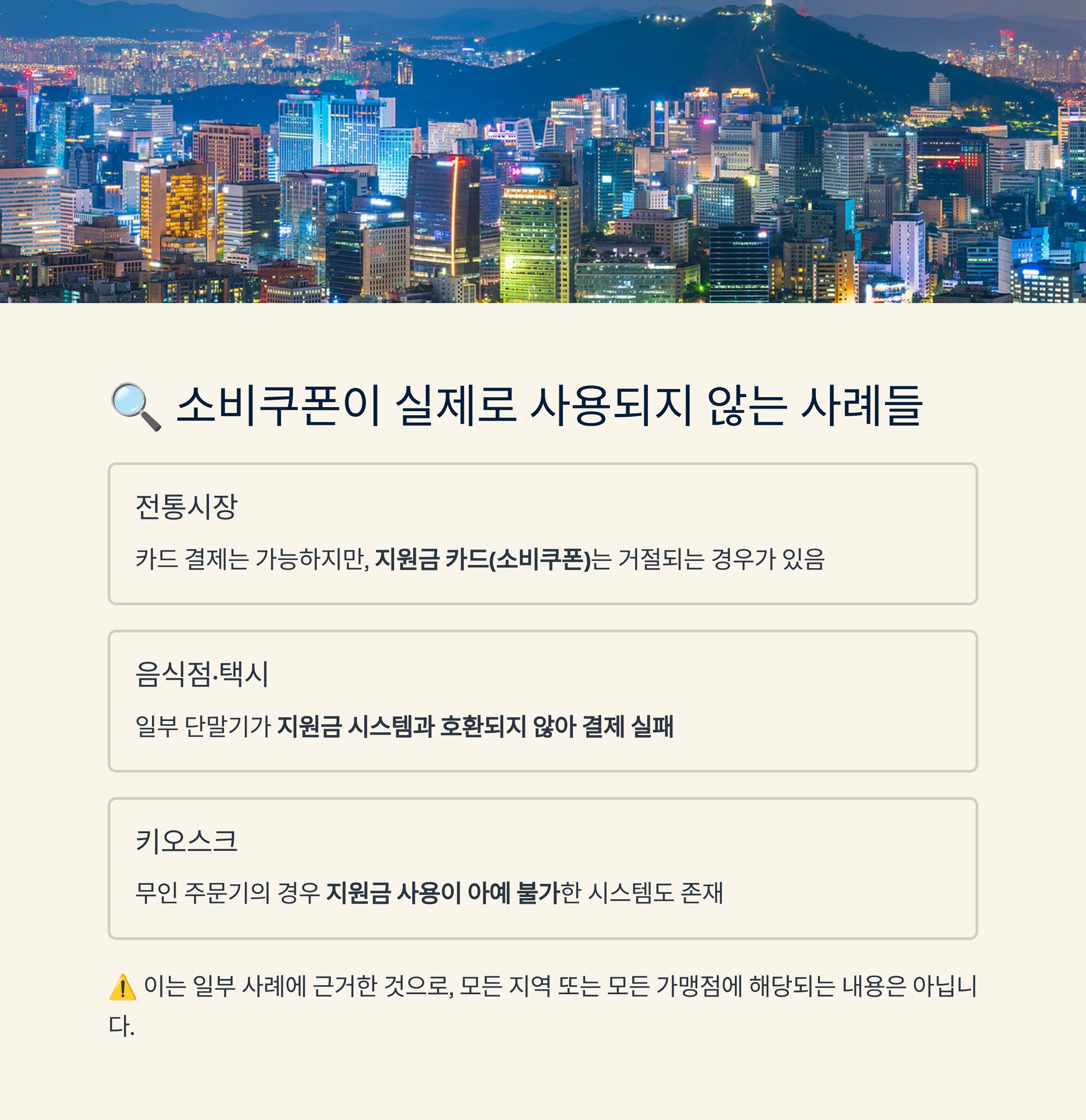 | 전통시장 | 카드 결제는 가능하지만, **지원금 카드(소비쿠폰)**는 거절되는 경우가 있음 |