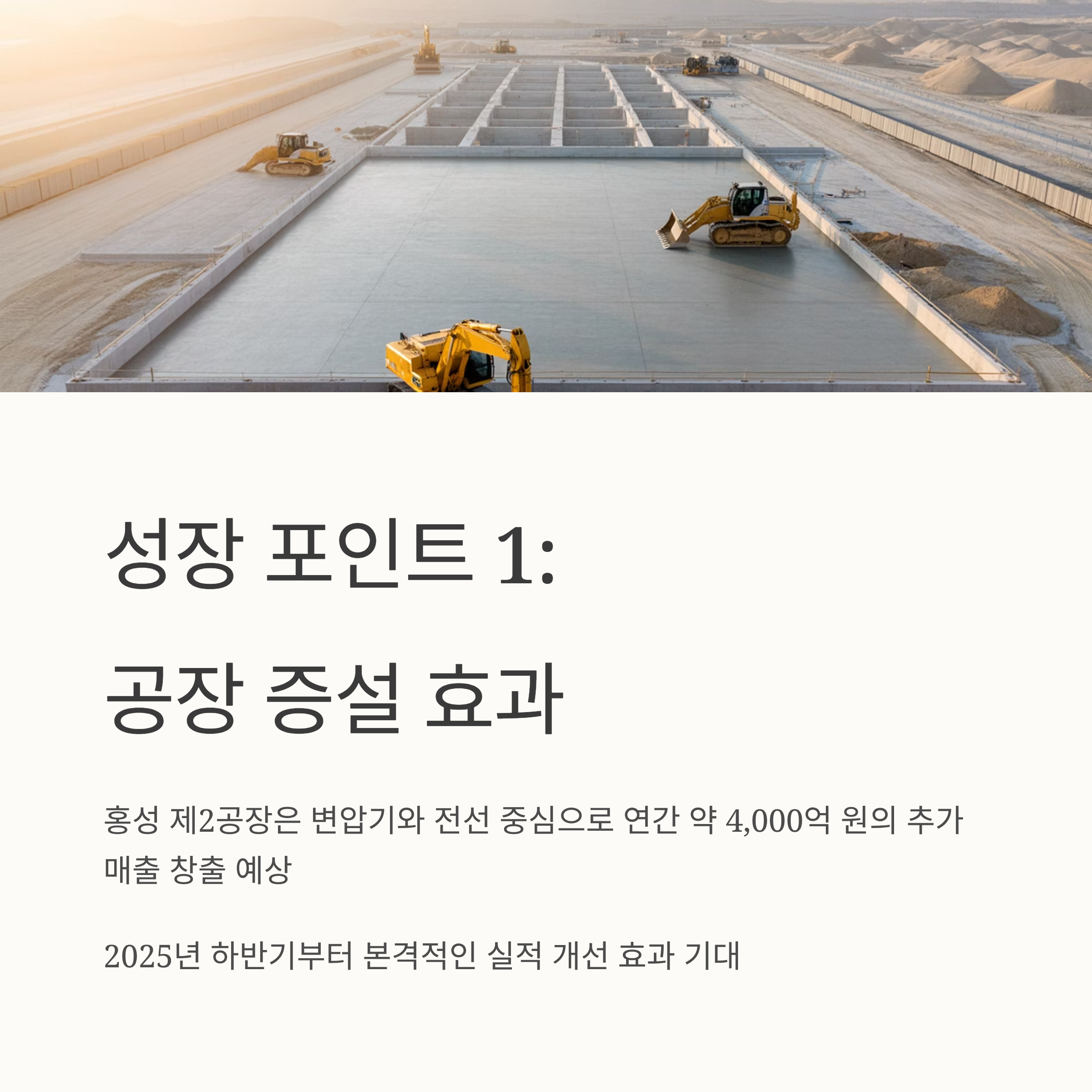 특히 중전기기 부문이 분기 사상 최대 실적을 기록했습니다. 이는 2024년 말 완공된 홍성 제2공장의 가동률이 빠르게 올라가고 있기 때문인데요. 단순히 일시적인 성장이 아니라, 2025년 하반기부터 본격적으로 실적 개선이 이어질 것으로 예상됩니다.