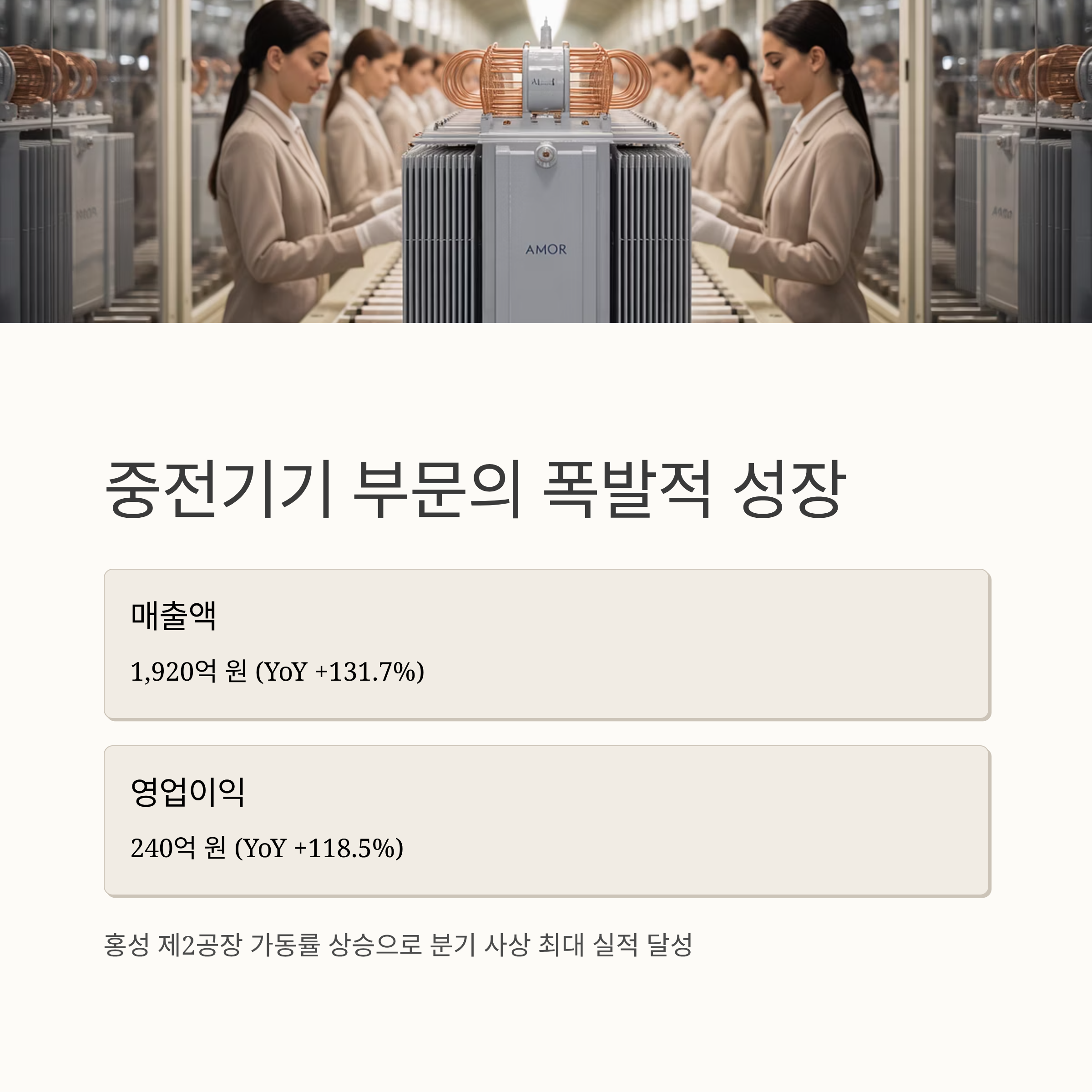| 중전기기 | 1,920억 원 (YoY +131.7%) | 240억 원 (YoY +118.5%) | 12.5% |
