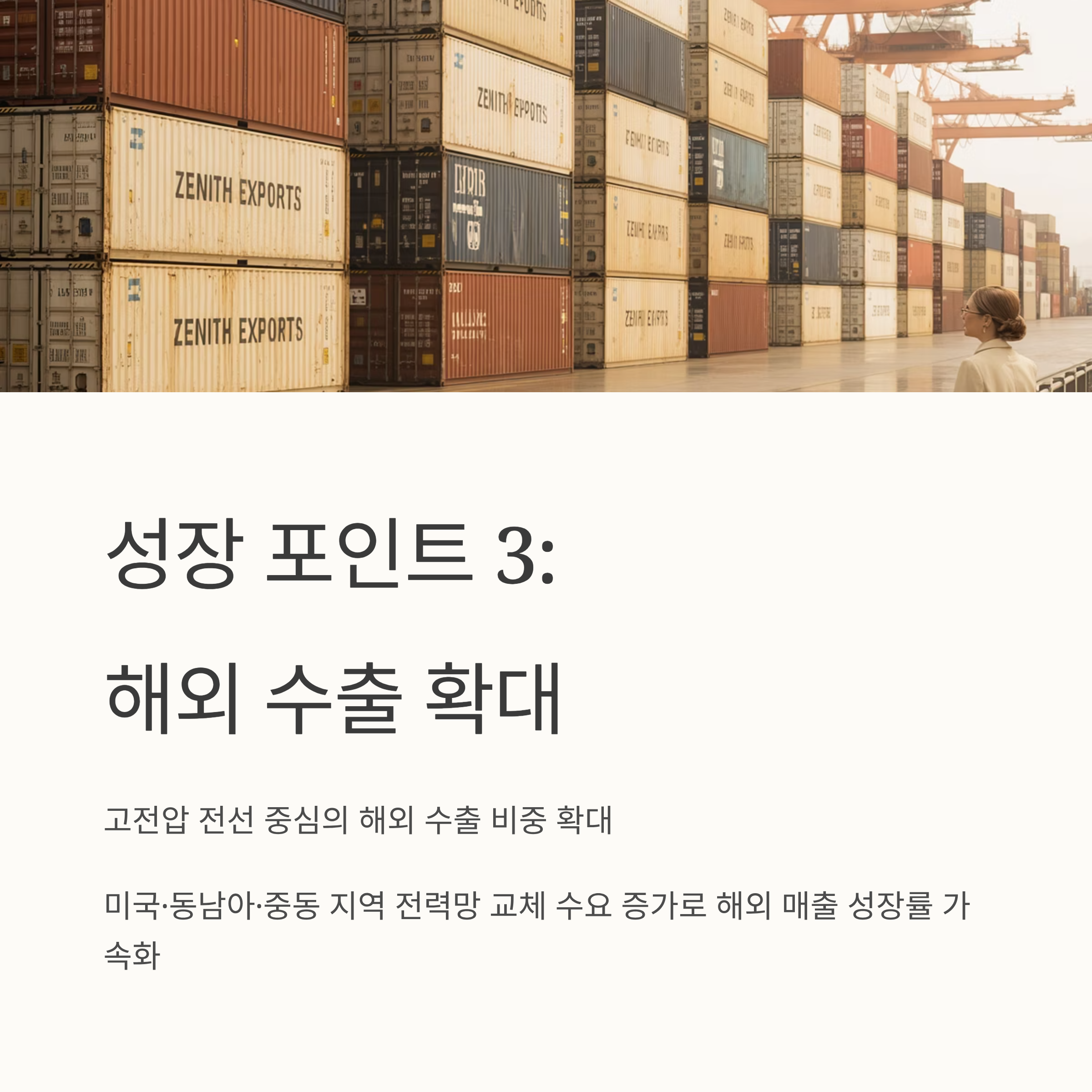 - 글로벌 전력기기 사이클 장기화와 해외 수출 확대가 장기 성장의 핵심 동력입니다.