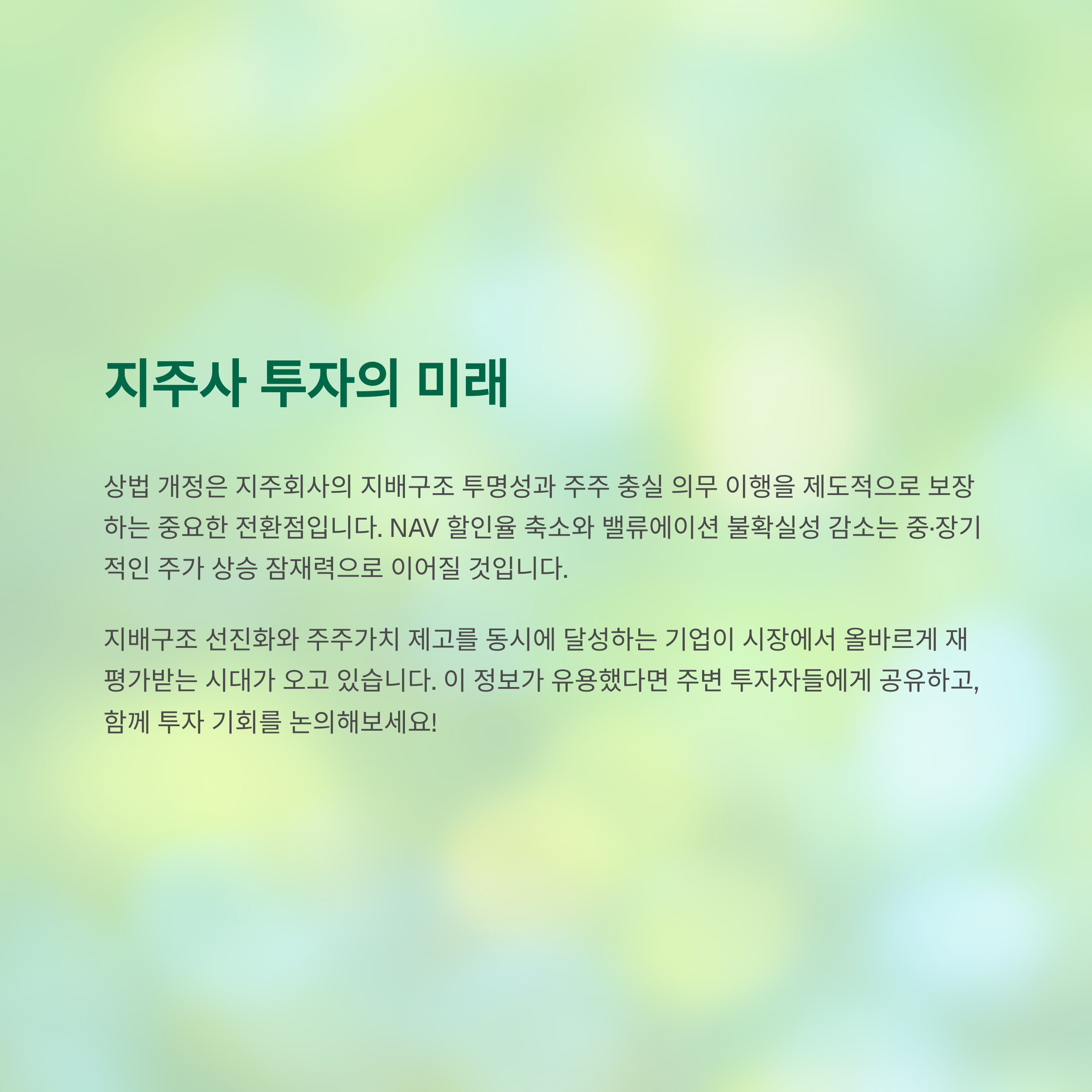 상법 개정은 지주회사의 지배구조 투명성과 회사·주주 충실 의무 이행을 제도적으로 보장하는 계기가 됩니다. 이를 통해 NAV 할인율이 축소되고 밸류에이션 불확실성이 감소하면서 중·장기적인 주가 상승 잠재력이 부각될 것입니다. 다만 비상장 자회사 이벤트 리스크와 단기 변동성 확대 가능성은 여전히 유의해야 합니다. 투자자는 규제 환경 변화와 주주환원 정책 실행 여부를 지속적으로 점검하며 대응 전략을 수립해야 합니다. 최종적으로, 지배구조 선진화와 주주가치 제고를 동시에 달성한 기업이 시장에서 올바르게 재평가받는 구조로 나아갈 것입니다.
