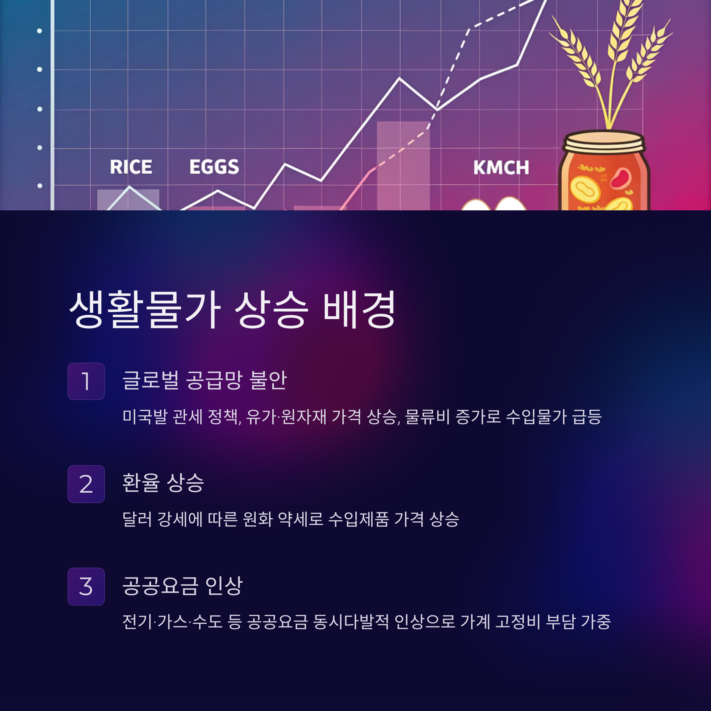 - 글로벌 공급망 불안: 미국발 관세 정책, 유가·원자재 가격 상승, 물류비 증가 등 대외 변수로 수입물가가 급등.