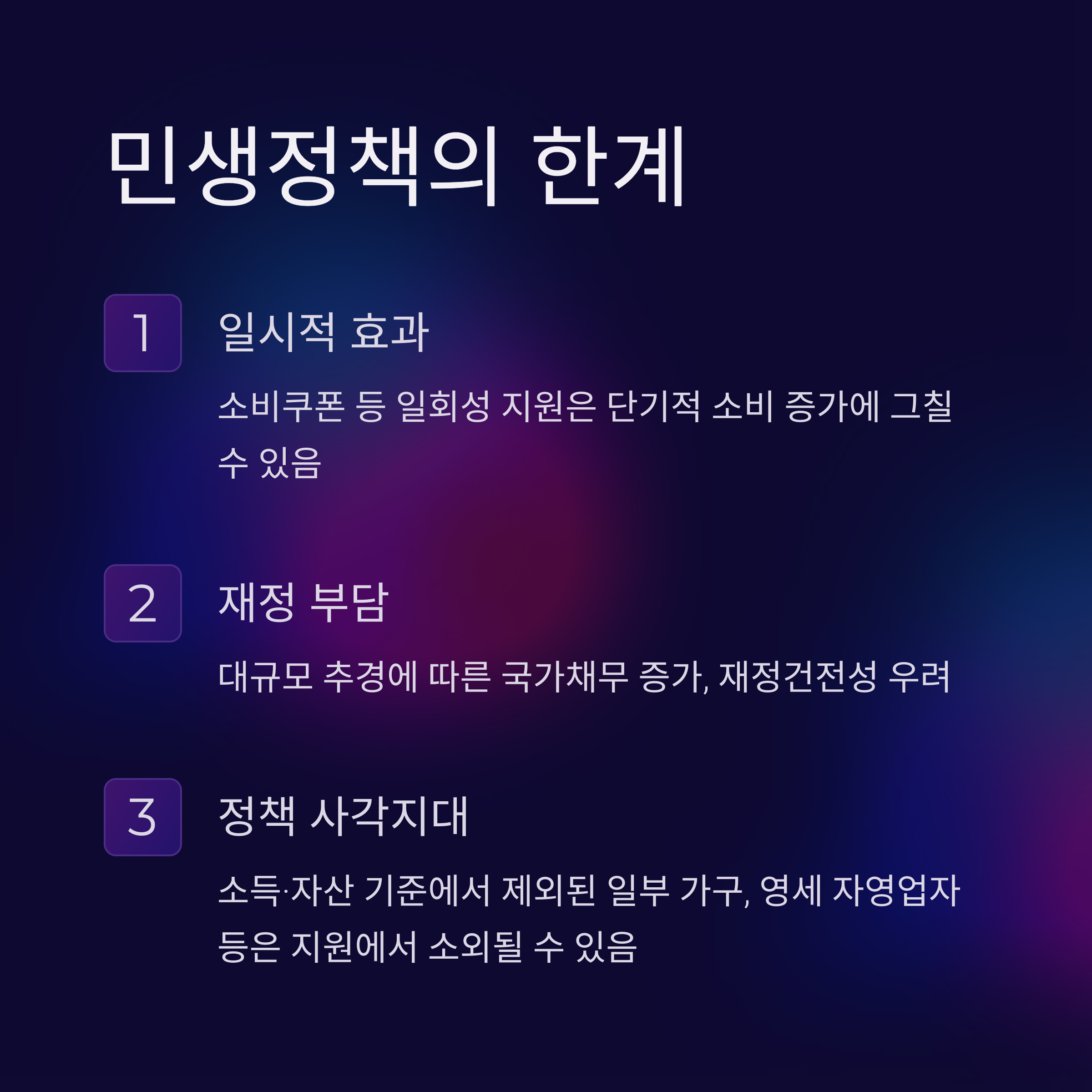- 정책 사각지대: 소득·자산 기준에서 제외된 일부 가구, 영세 자영업자 등은 지원에서 소외될 수 있음.