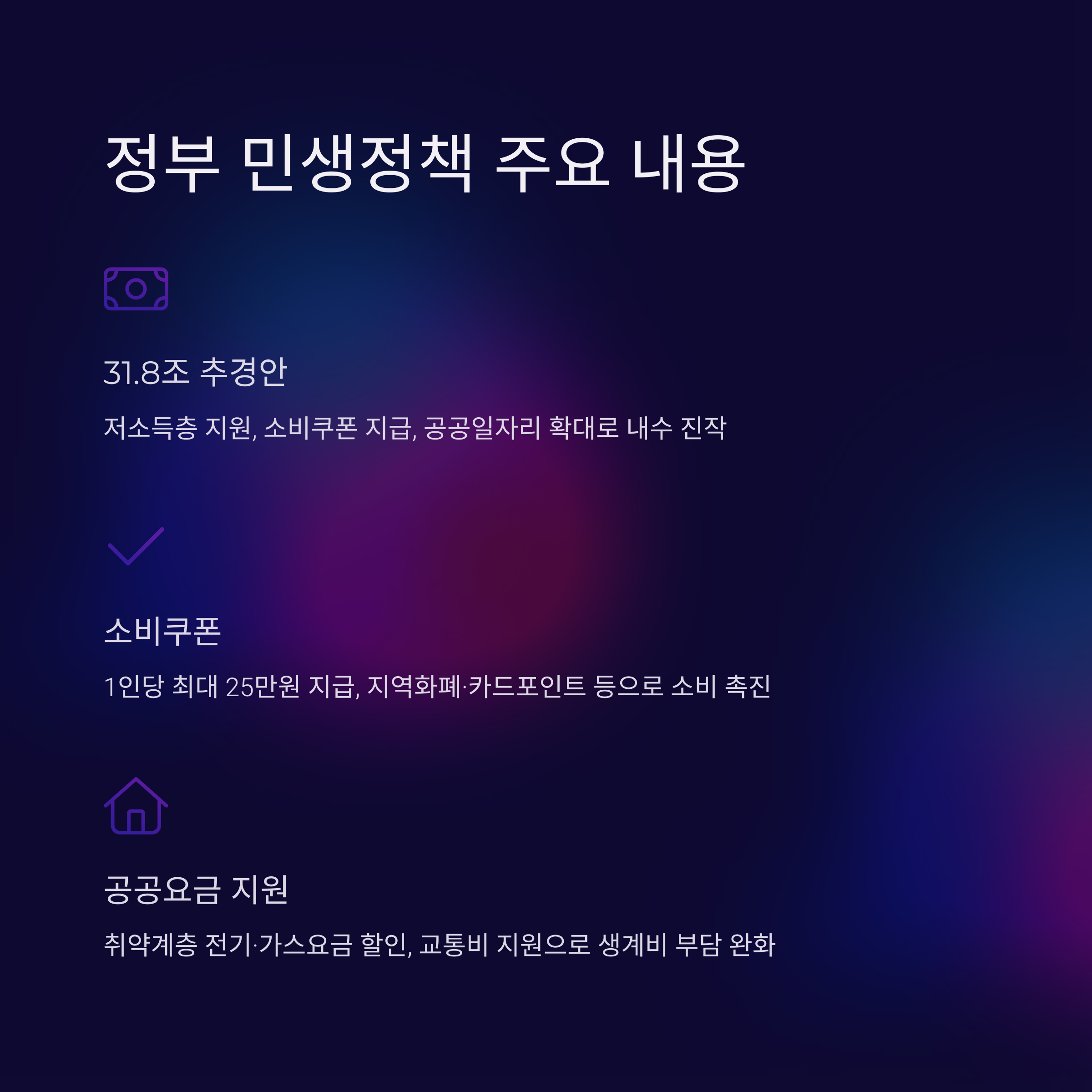 | 소비쿠폰 | 1인당 최대 25만원 지급, 지역화폐·카드포인트 등 | 소비 촉진, 지역경제 활성화 |