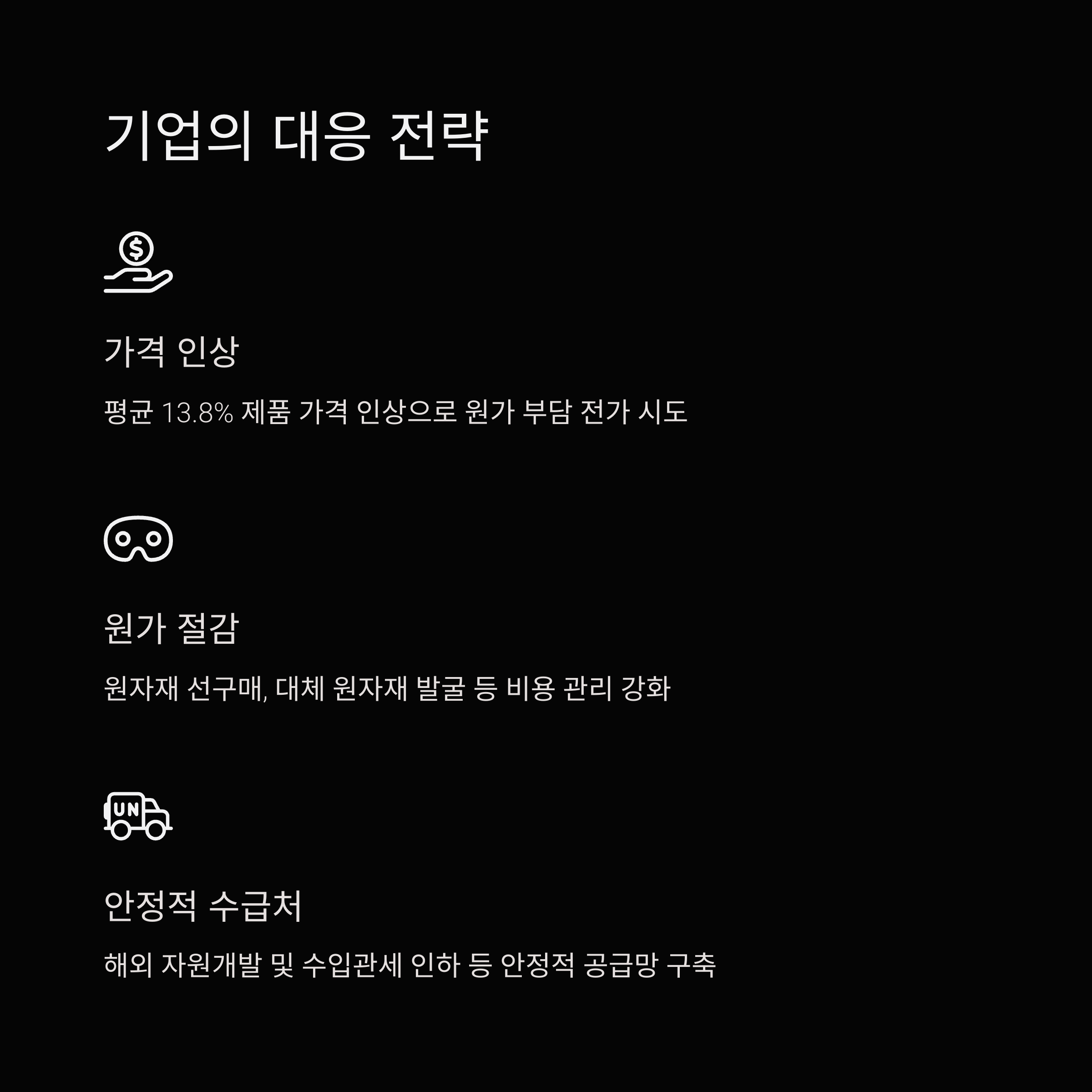 - 제품 가격 인상(평균 13.8%), 원가 절감, 원자재 선구매, 대체 원자재 발굴 등으로 대응하고 있으나, 가격 전가가 어려운 업종은 수익성 악화가 불가피합니다.