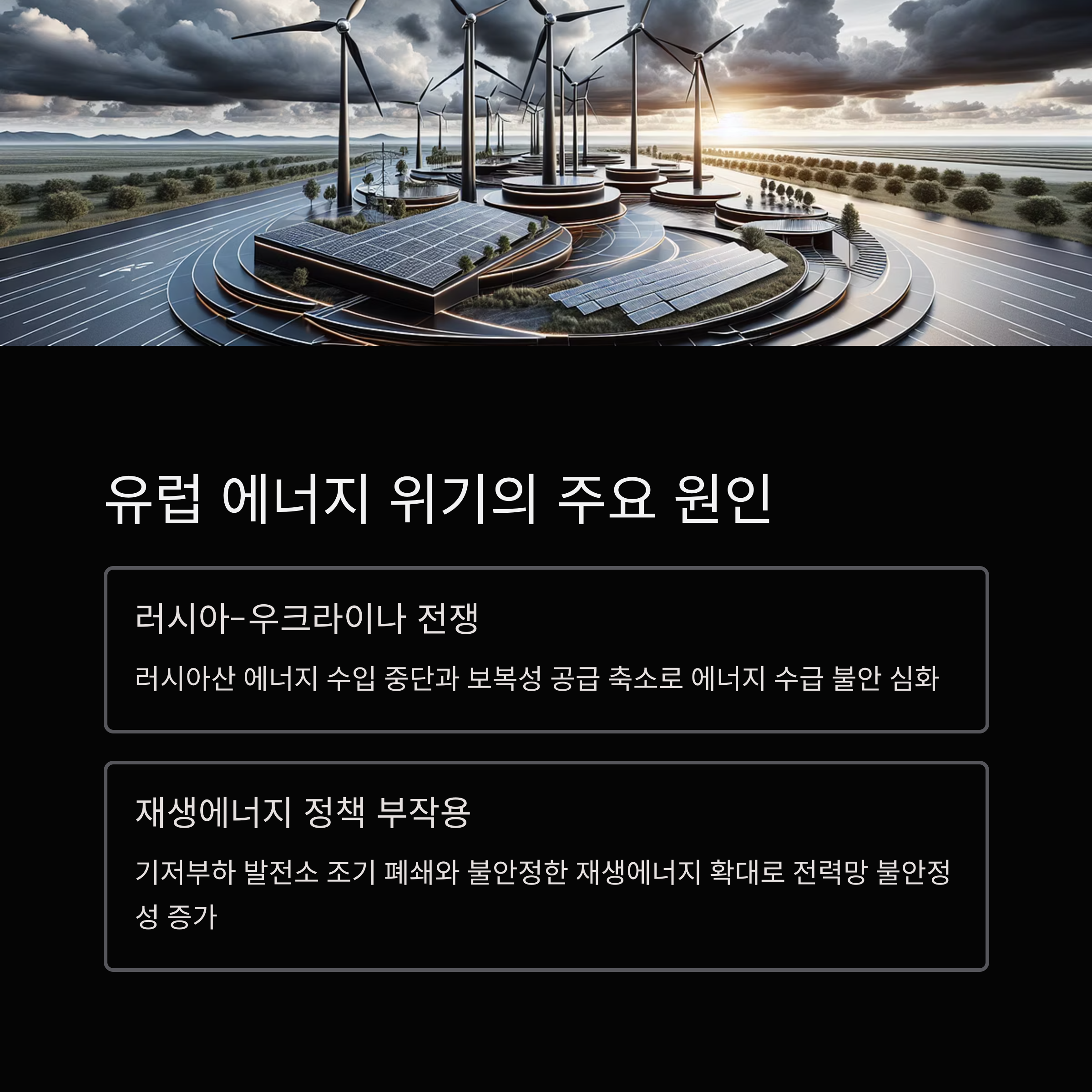 - 유럽의 에너지 위기는 러시아-우크라이나 전쟁, 재생에너지 정책의 부작용, 에너지 비용 급등 등 구조적 요인이 복합적으로 작용한 결과입니다.